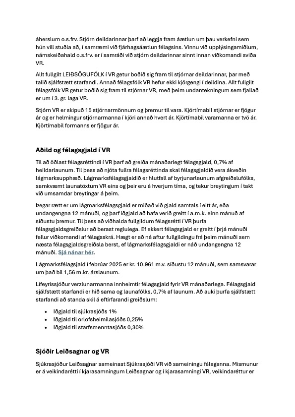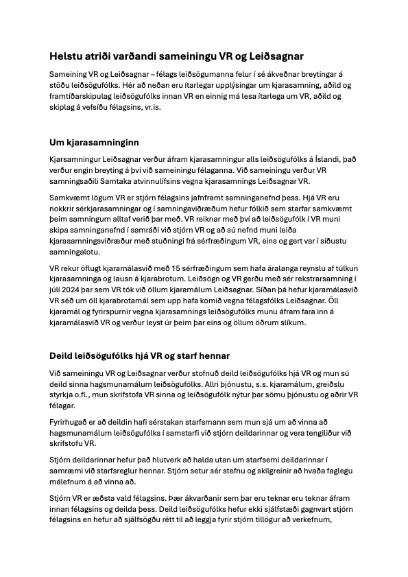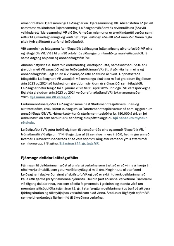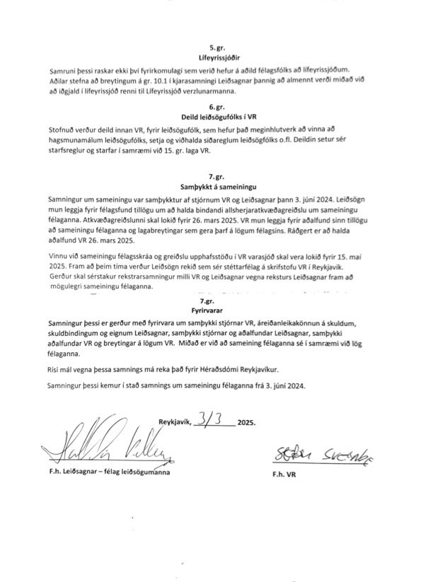 Á sama tíma skoðaði stjórn VR málið frá sinni hlið og kom með sína ákvörðun hvað það snerti, en félagsfólk VR þarf að samþykkja sameininguna á aðalfundi sínum 2025. Í kjölfar alls þessa var unnin lokaútgáfa samnings milli Leiðsagnar og VR og lokaútgáfa að reglum fyrir starfsemi deildar leiðsögufólks innan VR. Þessi gögn voru kynnt á félagsfundinum 11. mars og þau eru fyrirliggjandi á innri vef Leiðsagnar.